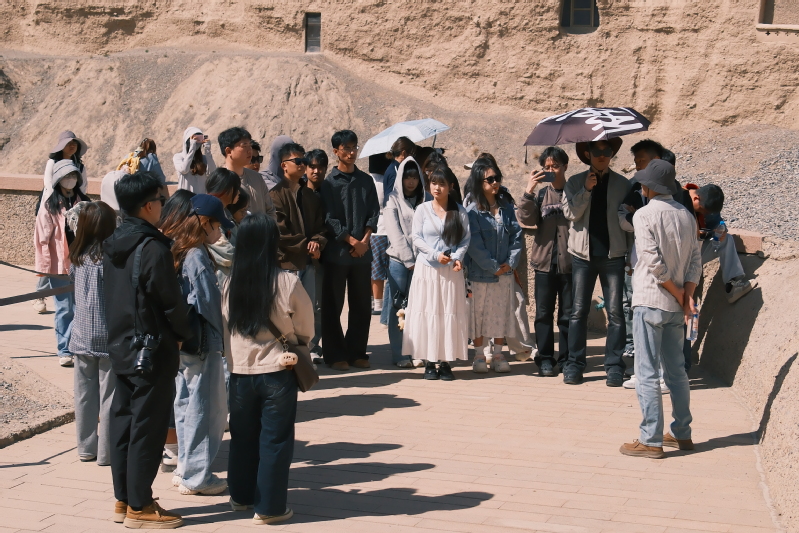 2025年5月6—12日,新葡的京集团35222vip2022级环境设计专业室内设计和景观设计方向共计57位同学,在两位专业老师带领下赴敦煌开展为期一周的考察实践学习活动。考察期间,同学们先后参观了敦煌书局、敦煌印局、大地之子、敦煌博物馆和敦煌城市规划馆,考察了莫高窟与榆林窟的壁画、彩塑以及石窟建筑艺术,并进行了《千年莫高·泥坯壁画》实践课程体验。