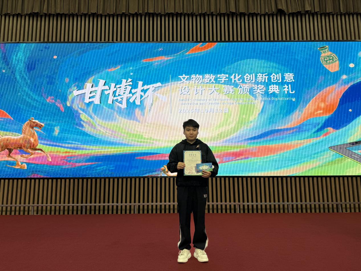 10月12日,首届“甘博杯”文物数字化创新创意设计大赛颁奖典礼在西北师范大学圆满落幕。新葡的京官网2024级视觉传达设计专业学生刘思晨在视觉艺术类比赛中荣获三等奖,并获得奖金500元及价值300元的甘肃省博物馆文创店礼品卡。