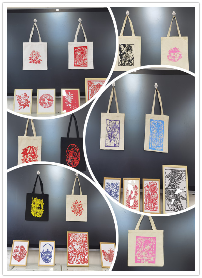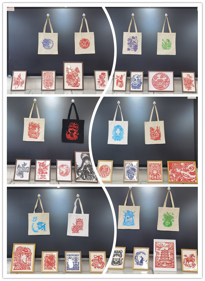 剪纸新材料的运用是课程的重要创新。同学们采用剪纸转印技术,将传统生肖、“喜鹊登梅”“福禄寿喜”、花鸟鱼虫等吉祥纹样及当代动漫元素,通过热转印工艺呈现于白色帆布包日常用品之上。这种创新,既是传统题材的现代表达,也是生活场景的艺术转化,兼顾教学严谨性与民间艺术本真性,展现非遗在青春视角下的创新活力。本次展览作品样式丰富多样,充分展示了新葡的京官网学生扎实的专业功底,有力地促进了学院艺术氛围的良性互动。